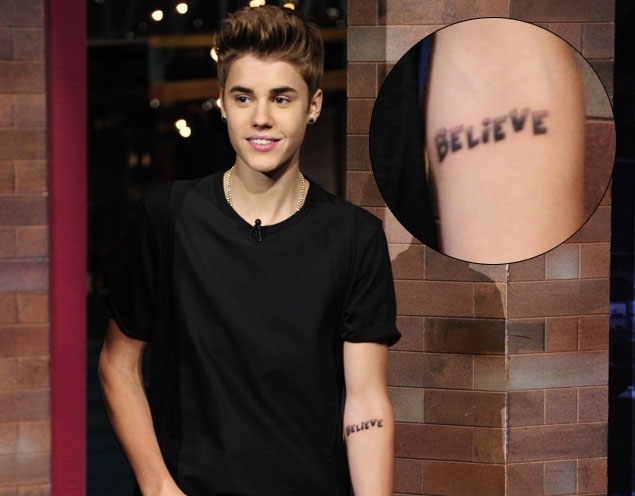 Первой альбом Бибера имеет название «Believe», именно это слово набито на руке молодого человека, тату выполнено сразу после выпуска музыкального произведения, переводится название с английского как «верь, верить».