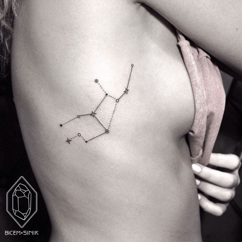 Прекрасная альтернатива большим картинкам. Нательный рисунок отличается минималистичным дизайном, а наносится на запястье, ребро, область спины. Загадочное созвездие популярно среди девушек.Техника выполнения