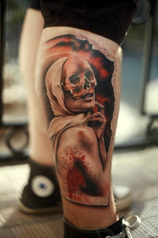 Это настоящий шедевр! Нога это хорошее место, чтобы для нанесения великолепного рисунка. Паутина на лице девушки свидетельствует о смерти, а розы вокруг – это жизнь.