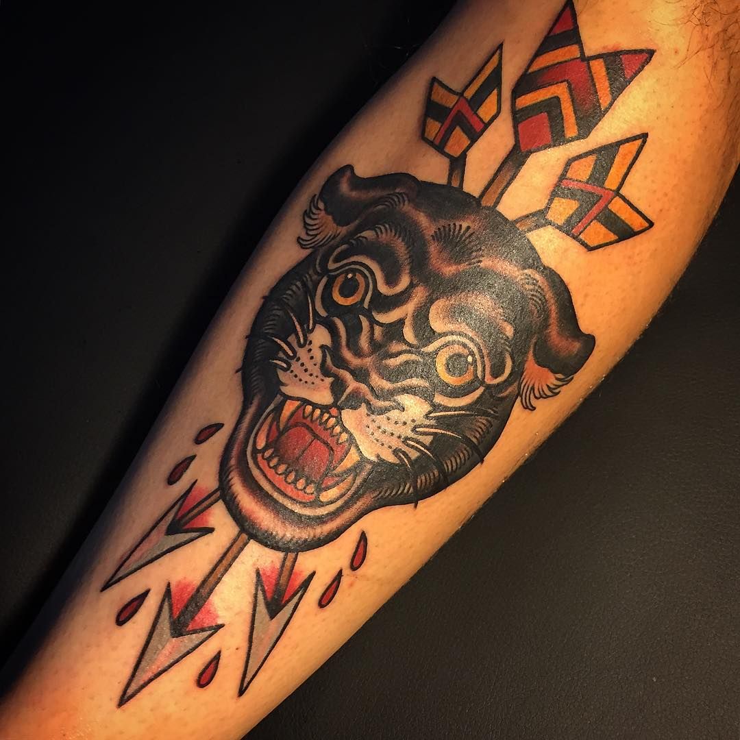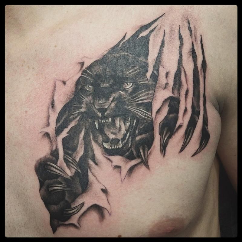 В татуировках пантеры всегда изображаются на охоте. Их низкая стойка и проницательный взгляд дают ощущение опасности и волнения, которые лучше всего можно уловить, если татуировка расположена поверх основной группы мышц. Таким образом, каждое подергивание и поворот создает иллюзию движения татуировки, что добавляет привлекательности вашему боди-арту.