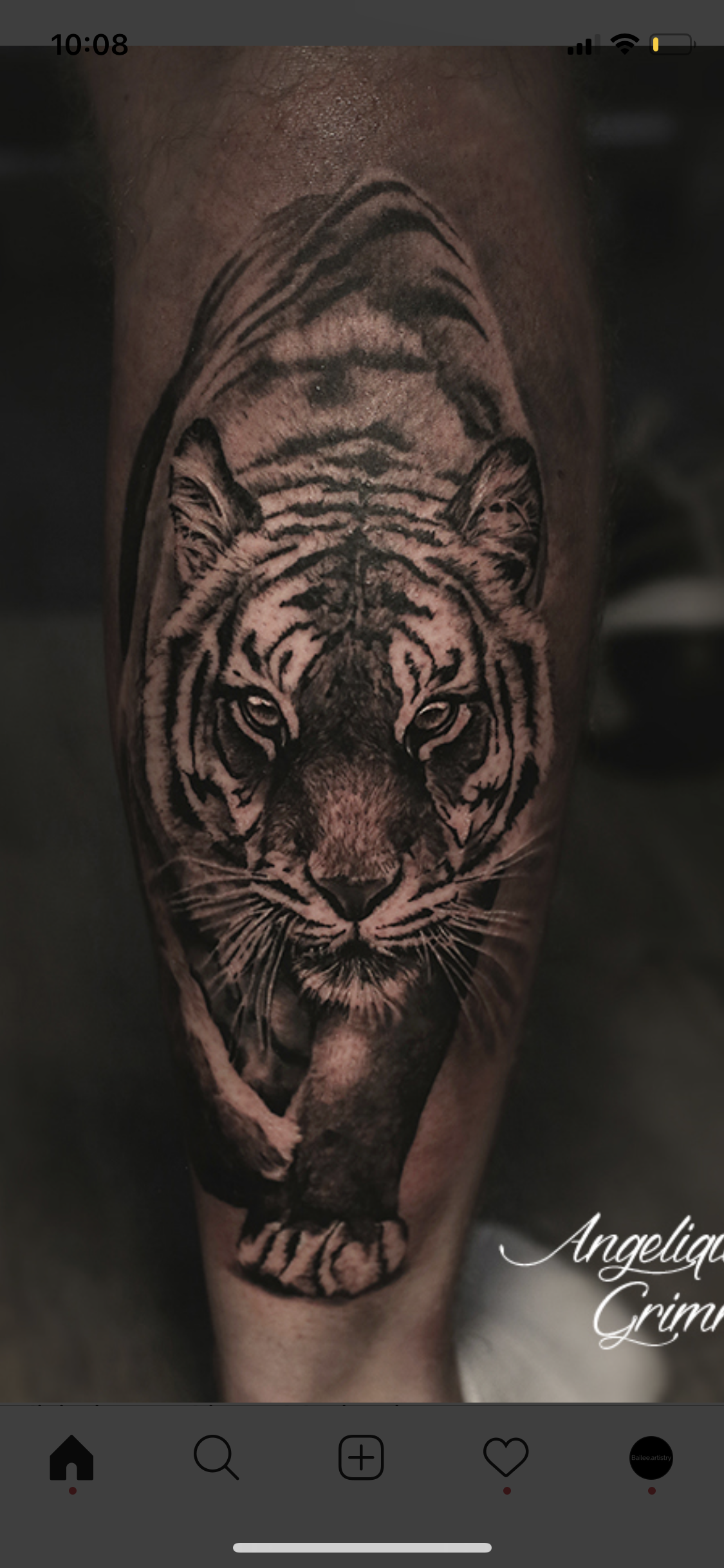 С невероятным художественным оформлением этот тигр в охотничьем стиле полностью перетекает от бедра к части тела. Эта деталь будет отлично смотреться как часть дизайна рукава или предплечья.