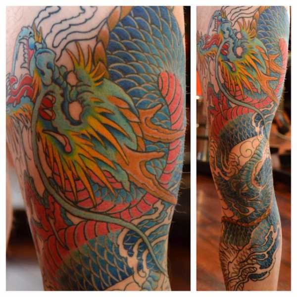 Цвета тату подчеркивают соперничество – сочетание ярких и тусклых оттенков, черного и белого усиливает восприятие. Изображение наносят на спину, плечи, лопатки, предплечья, грудь, шею, ноги. Тату в виде демона часто наносят по всей руке, формируя рукав. Выбирают различные цветовые решения, популярны черно-белые образы.
