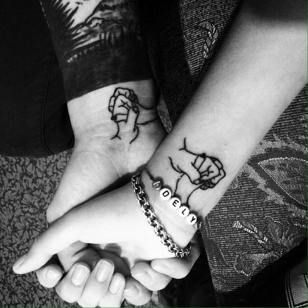 Подразумевается, что эскиз будет разбит на несколько частей, каждая из которых набивается на теле участника события. Когда друзья захотят кому-нибудь продемонстрировать свою пламенную привязанность, им нужно всего лишь соединить части тел вместе, и тогда откроется полное изображение. Конечно, для этого идеально подошли бы пальцы рук, запястья и предплечья, но есть примеры и других решений. - Парные надписи. Это могут быть одинаковые фразы, афоризмы, изречения, либо части одного предложения, набитые на разных телах. Конечно, желательно, чтобы части фразы имели смысл вне привязанности ко второй половинке.