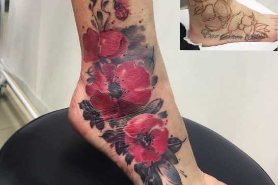- Переделывать или перекрывать нательный рисунок гораздо сложнее, чем наносить изображение «с нуля». Поэтому мастер должен иметь опыт подобной работы.