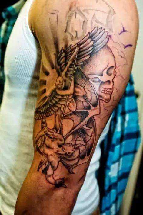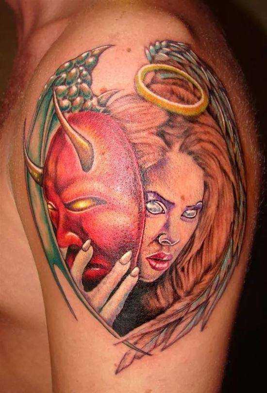 Если тату дьявола изображено вместе с ангелом, то это является символом борьбы добра со злом, где обычно добро побеждает.