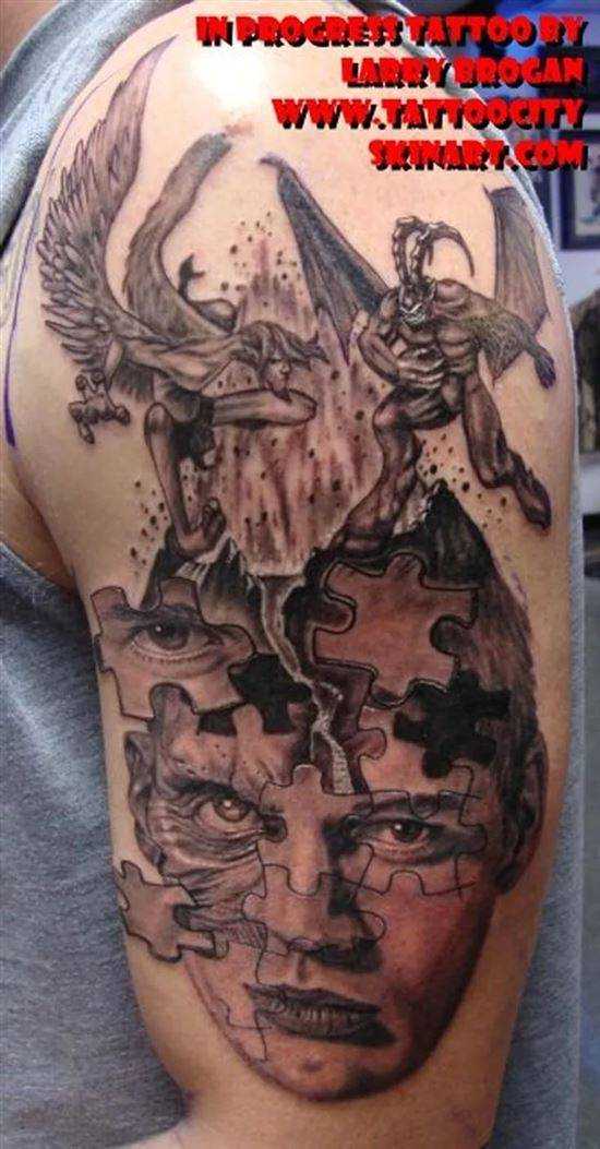 Полет фантазии художников в изображении тату борьба добра и зла не ограничен. Скрытый смысл двух противоположностей можно изобразить в виде ангела и демона. Сочетание двух противоположностей в одном рисунке имеет несколько значений. Это любовь и ненависть, добро и зло, безгрешность, чистота помыслов и греховность, темные силы. Использование контрастных цветов еще больше усиливают смысловую нагрузку изображения.