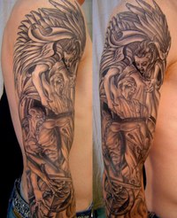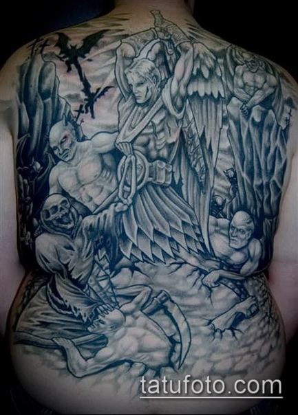 У мужчин изображение ангела символизирует смирение перед выпавшими трудностями, защищает от сил зла. Популярными являются эскизы тату со сражением между ангелом и демоном.