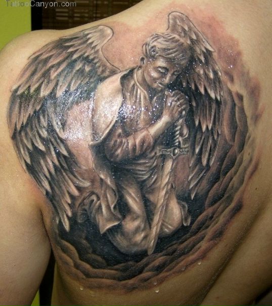 24. Этот ангел – мужской образ в молитве.Черно-белая татуировка изображена очень подробно.