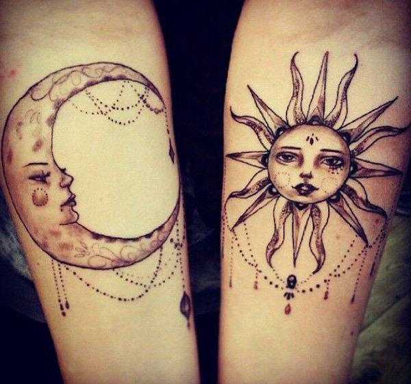 Существует множество вариантов, где солнце – лишь часть татуировки. Популярны варианты с изображением двух небесных светил – Луны и Солнца, которые олицетворяют равновесие, союз двух противоположностей, единство мужского и женского начал. Часто изображают частичное затмение, а также луну с солнечными лучами.