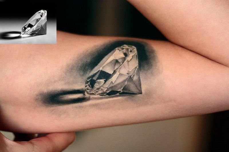 Сегодня большой популярностью пользуется татуировка с изображением драгоценного и красивого камня – алмаза. Он считается самым дорогим и прочным камнем в мире. Но по-настоящему красивым этот камень становиться только после огранки. Переливы его граней завораживают и притягивают взгляд. Татуировка алмаз уже не одно столетие пользуется большой популярностью. В современном искусстве татуировки изображение алмаза на теле человека довольно актуально.