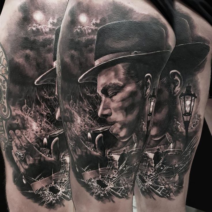 ..Когда заходит речь о гангстерских татуировках, люди представляют разные сюжеты: от культового оружия до винтажных автомобилей. И, конечно, выполненные в духе гангстер тату рисунки на теле, отражающие культуру американских контрабандистов начала ХХ века. Современные мастера нередко вдохновляются идеями, навеянными портретами самых известных гангстеров и бандитов, чьи истории жизни легли в основу фильмов, литературных произведений.