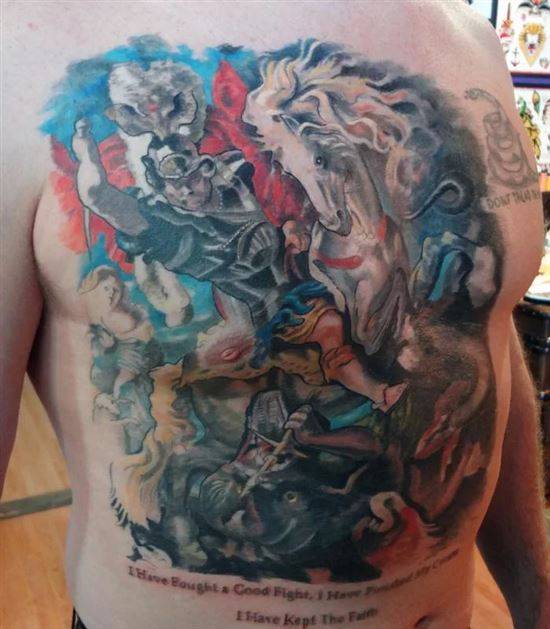Самым популярным сюжетом татуировки с Победоносцем, является изображение момент когда он убивает змея.