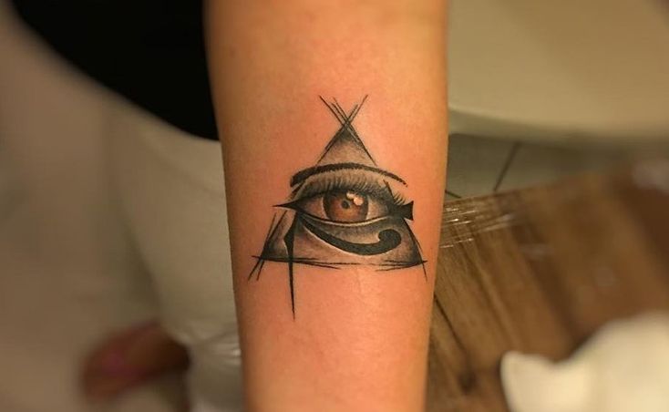 Оригинально смотрится татуировка с расположением глаза в треугольнике, и присутствует она во многих культурах. Как правило, этот символ предпочитают те, у кого вера является важной частью их жизни. Для подобного эскиза очень часто отдают предпочтение изображению Всевидящего Ока, и сам глаз может быть изображён как перед самой пирамидой, так и находиться внутри неё. В целом такое тату символизирует божественное начало и имеет альтернативное название – глаз Гора.