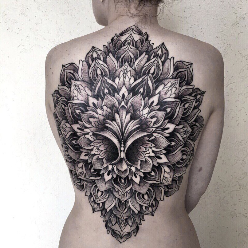 Фото тату масок в стиле графика на спине девушки