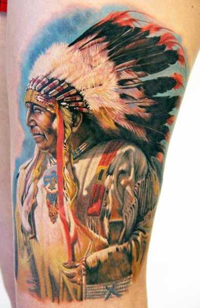 А ниже представлены фото татуировок с изображением индейца от разных мастеров.