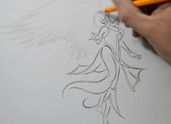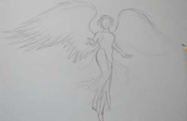 На этом этапе нужно затереть ластиком туловище ангела, а потом опять обвести четко контур рисунка – туловище, ноги, руки и платье.