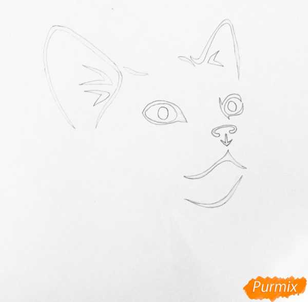 Теперь изобразим глаза, уши, дорисовываем пасть и проводим контур лба и затылка.