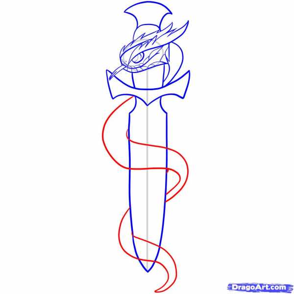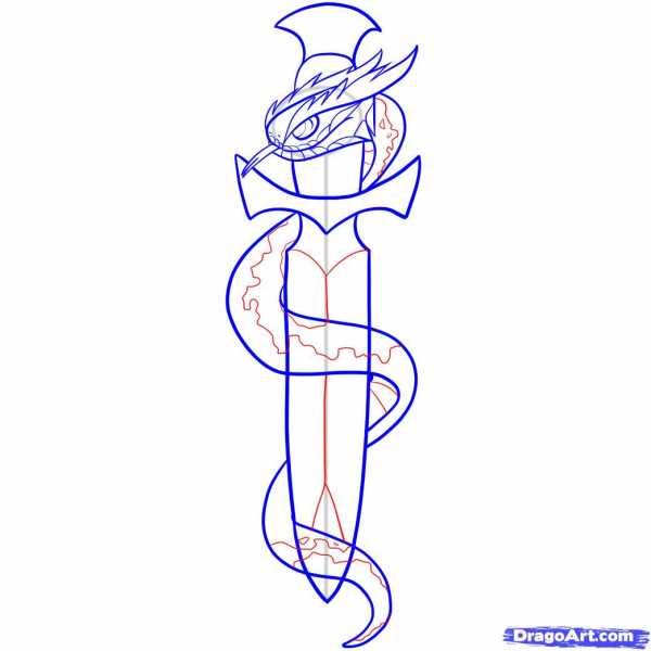 Теперь, когда вы уже нарисовали верхнюю часть тела змеи, вы можете приступить к прорисовке кинжала. Сперва начните с рукояти, затем нарисуйте гарду и после этого доведите линии клинка. Вы можете выбрать любой тип клинка, или вы можете при желании, нарисовать меч.