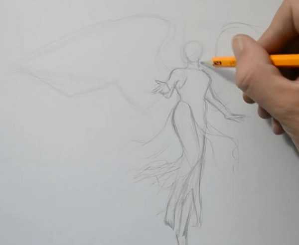 Теперь начните рисовать контур туловища ангела. Начните с ног, потом руки и платье.