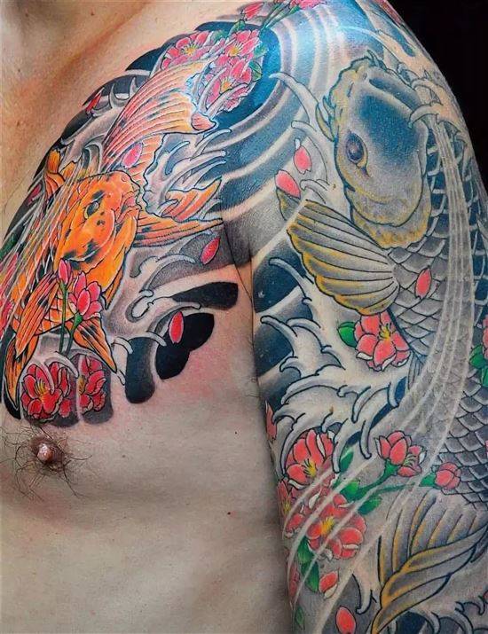Вы можете поместить кои прямо на плечо, перекрещивая с одной стороны на другую. Другой вариант — продолжить его прямо от рукава через плечо и грудь. Такая татуировка особенно хорошо смотрится, если выполнять ее на обеих сторонах тела.