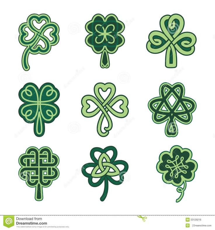 Клевер можно комбинировать с любыми изображениями. Это могут быть растения, цветы, узоры, игральные кости, деньги, горшочек с золотом или лепрекон.