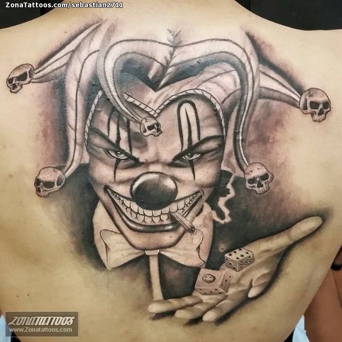 В каждой цирковой труппе есть карточные игроки, клоуны-любители мошенничества и фокусов. Поэтому рисунок шута, в который включены карты, кости — знак рискованной натуры, азартного игрока. Многие мужчины отображают в тату свои увлечения, поэтому в руках клоуна можно увидеть оружие, ножи, курительную трубку.