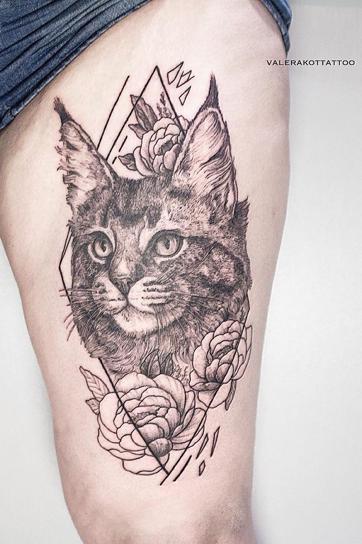 Благодаря большой протяженности бедра, голени, эти части тела идеальны для татуировки с изображением кошки в полный рост либо красиво прорисованной мордочкой. Лодыжки — идеальная зона для миниатюрных одиночных рисунков.