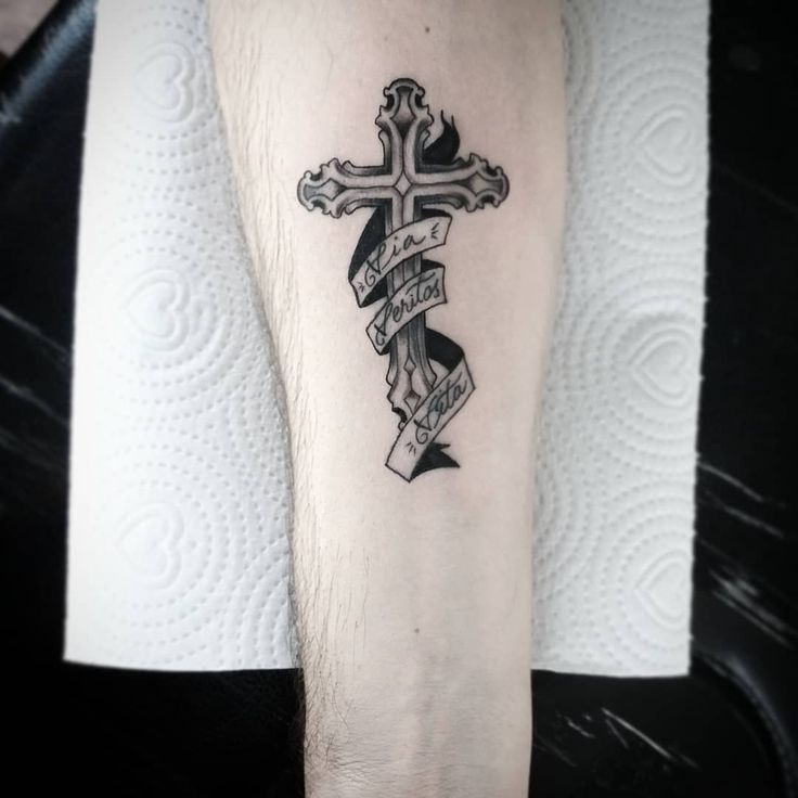 Тату на плече парня – крест с надписью