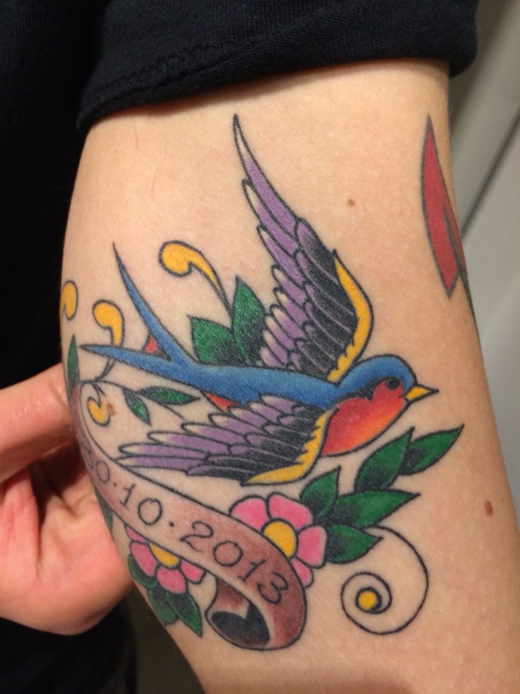 Цветная татуировка в виде ласточки и цветка на предплечье