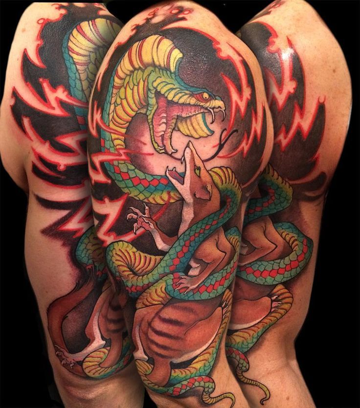Какими бы непредсказуемыми не казались поступки владельца тату «Мангуст», все они направлены на достижение единой цели – борьбе со злом. Вступить в эту борьбу он готов каждую минуту.