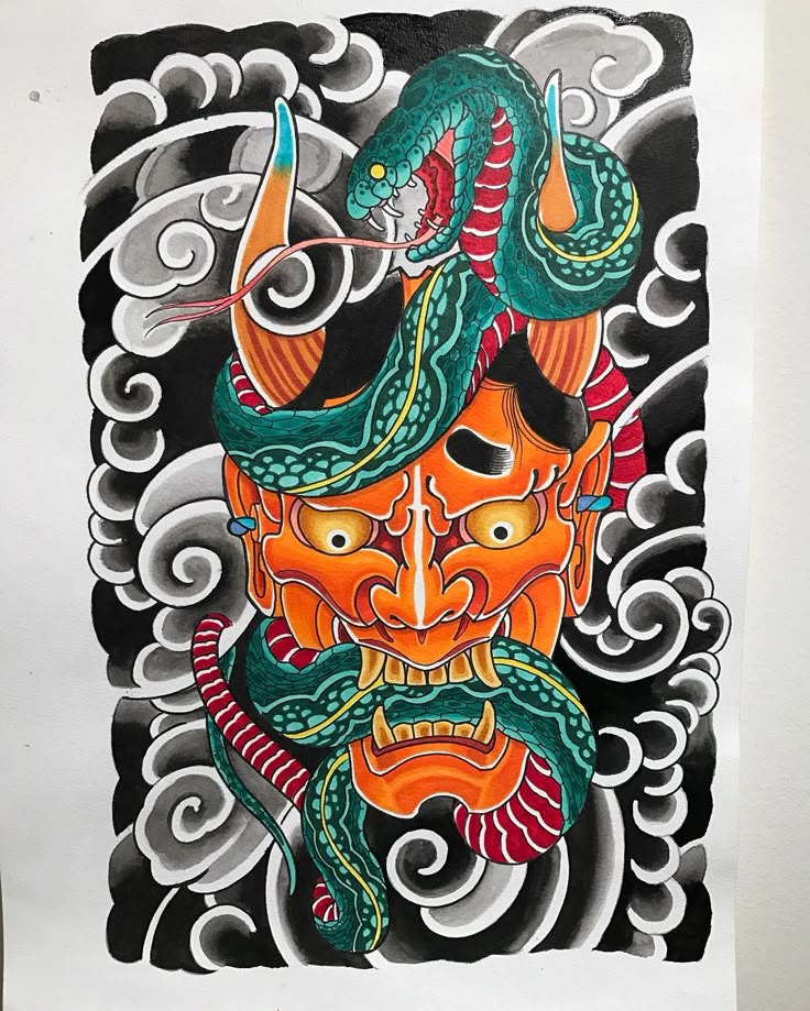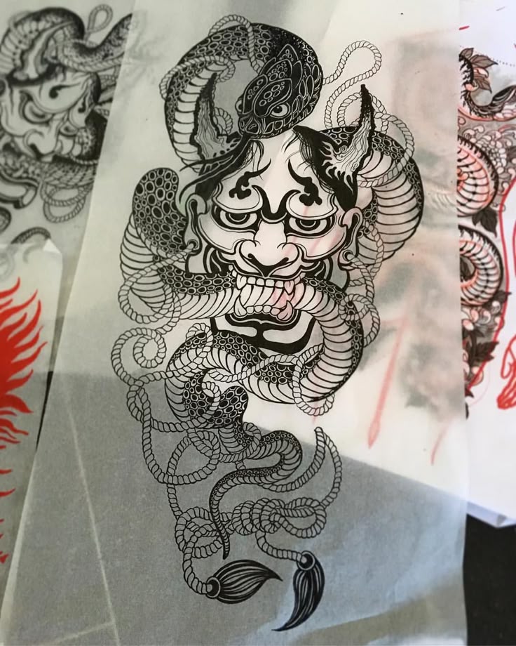 В татуировках японские театральные маски являются дополнительными элементами, указывающими на характер человека, либо служат заменой полного изображения существа, покровительство которого ожидают получить.