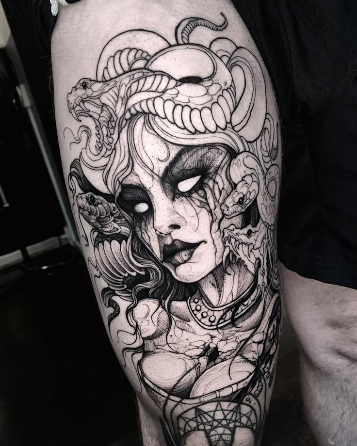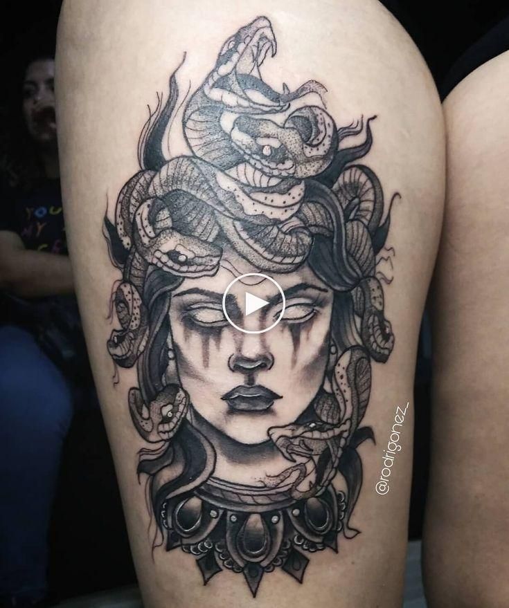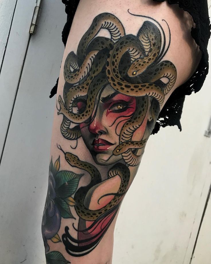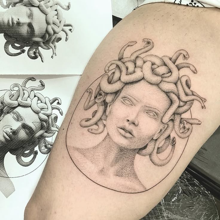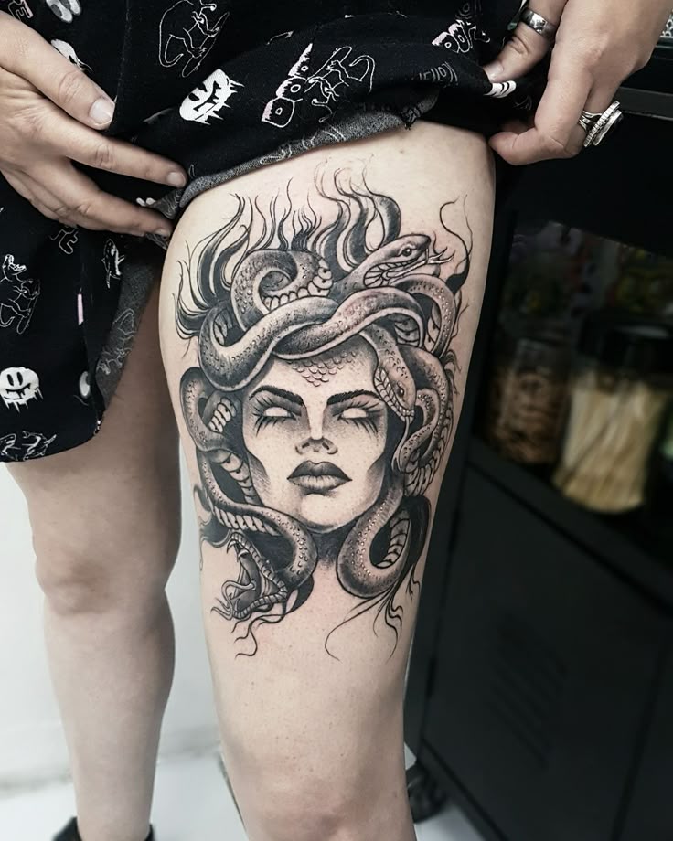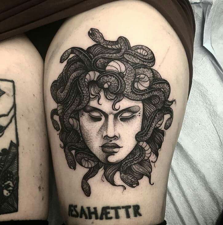 Для тех, кто ищет татуировку от среднего до большого размера, они выбирают татуировку Медузы на бедре, так как она дает холст хорошего размера для получения подробного замысловатого рисунка татуировки.