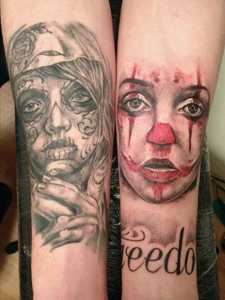 Оружие, клоуны, карты – так же могли определить принадлежность к роду деятельности или группировке, ведь эти атрибуты можно ассоциировать с гангстерами. В эту подгруппу можно отнести изображение клоунов или взаимодействие клоунов с деньгами или прочим. Правоохранительные органы США в 50-х создала каталог татуировок, который изучали в академиях, чтобы в дальнейшем распознавание самых серьезных мафиози и участников банд не занимало много времени, и было доведено до автоматизма.