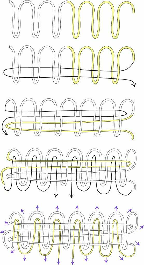 - Левым концом шнура создаются еще две вертикальные петли. Схема прохождения вверх — 1–3–1–3 (под одним шнуром — над тремя — под одним — над тремя). При прохождении вниз — 2–1–3–1–1 (под двумя шнурами — над одним — под тремя — над одним — под одним).