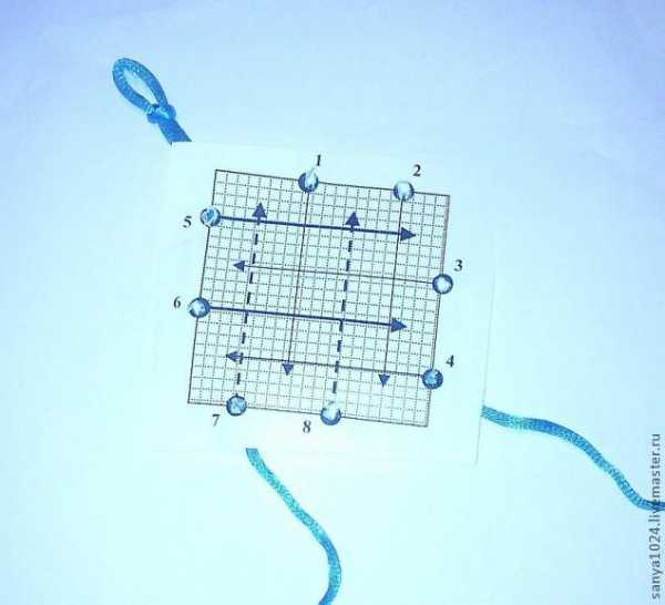 и ведем обратно над петлей №5, внутри петли №3, над петлей №6, внутри петли №4. И обратно в дырочку. Булавки, удерживающие петли №3 и 4, можно убрать.