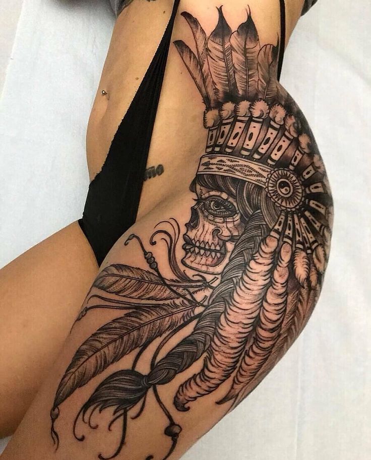 Татуировка на бедре с изображением черепа. Головной убор из перьев напоминает об американских индейцах.