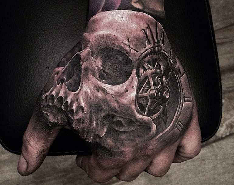 Только представьте, что адвокат или учитель носит такой рисунок, да еще и на таком видном месте. Это выглядит слегка ненормально в данном обществе. Однако для многих даже род профессии не становится преградой для того, чтобы сделать тату черепа на кисти руки.