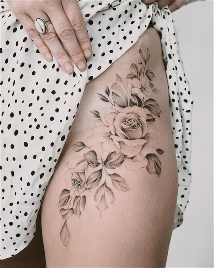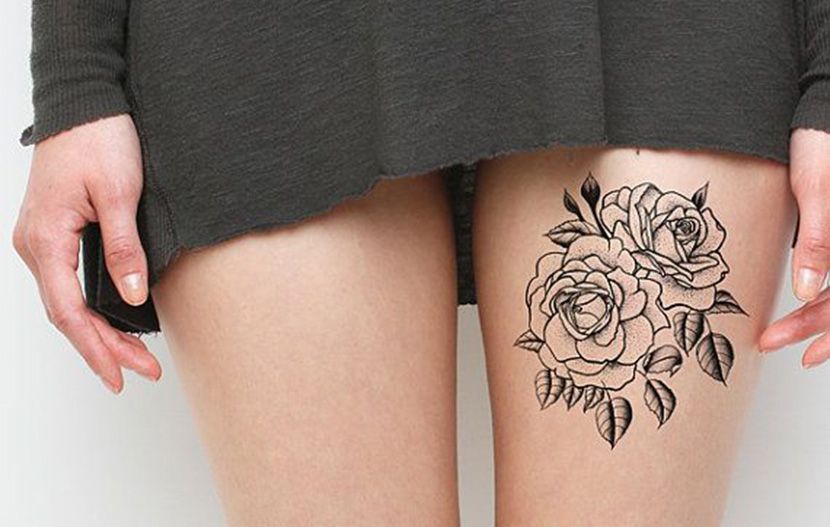 - Розы – естественно, розы всегда популярны, когда речь идет о татуировках. Они являются символом красоты и женственности. Более того, они, вероятно, самые популярные цветы. На бедрах они выглядят потрясающе и служат естественным дополнением к вашему общему стилю.