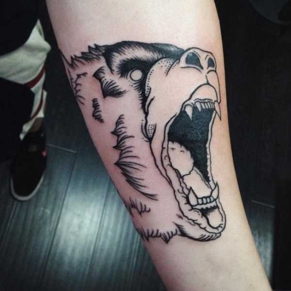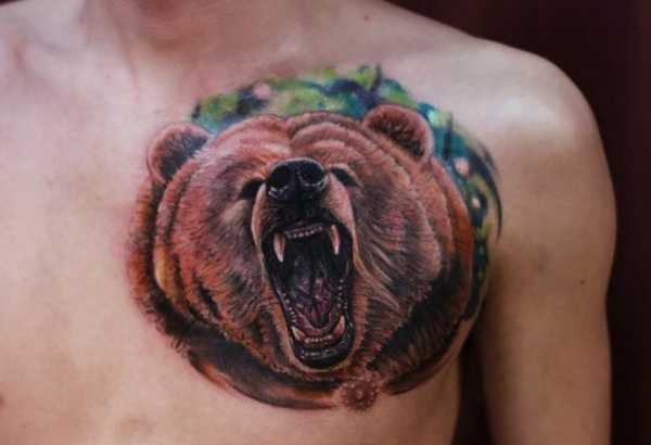 Оскал медведяЧтобы подчеркнуть свою силу, отвагу и агрессивный характер, многие мужчины изображают на своем теле оскал медведя. Он означает, что обладатель этой тату не боится врагов и готов сразиться с ними в любую секунду.