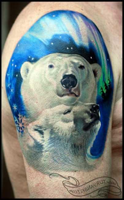 2Татуировка с изображением белого медведя наделяет своего обладателя одиночеством и самостоятельностью. Такой человек, как правило, держится в стороне от общества, привык решать все самостоятельно. Он не может быть командным игроком. Этот символ наносят и те, кто желает уберечь свою территорию от чужаков, выжить в любой ситуации, несмотря на жестокие условия. Мужчины из северных народностей очень часто наносили изображение белого медведя на свое тело. Сейчас эта тату не менее популярна. Чтобы белые краски не сливались с телом, белого мишку набивают на черном или любом другом фоне.