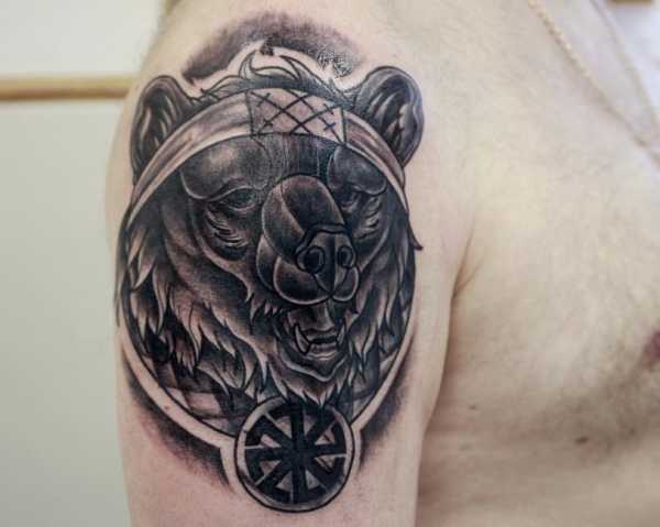 Тату в виде медведя имеет кельтское происхождение. Для воинов образ зверя стал эмблемой, а для слабой половины общества – олицетворением деторождения. С тех далеких времен изображение трактуется двояко: может означать агрессию, смелость, физическую силу, с другой стороны, символизировать материнскую заботу и выведение потомства.