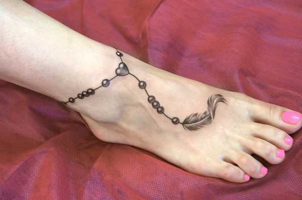 Татуировка отлично смотрится на любой части женской ножки. И большинство девушек предпочитают делать тату в области лодыжки и щиколотки. На щиколотке отлично будет выглядеть какой-нибудь узор, а также изображение солнца или звезд. Популярность приобрела тату в виде браслета (который будто обволакивает щиколотку). Если сделать татуировку в виде медальона с цепочкой, то она придаст вашим ногам шик и красоту. На лодыжке отлично будет смотреться изображение в виде цветов, а также различные надписи. Многие делают надписи, которые начинаются на одной лодыжке, а заканчиваются на другой.