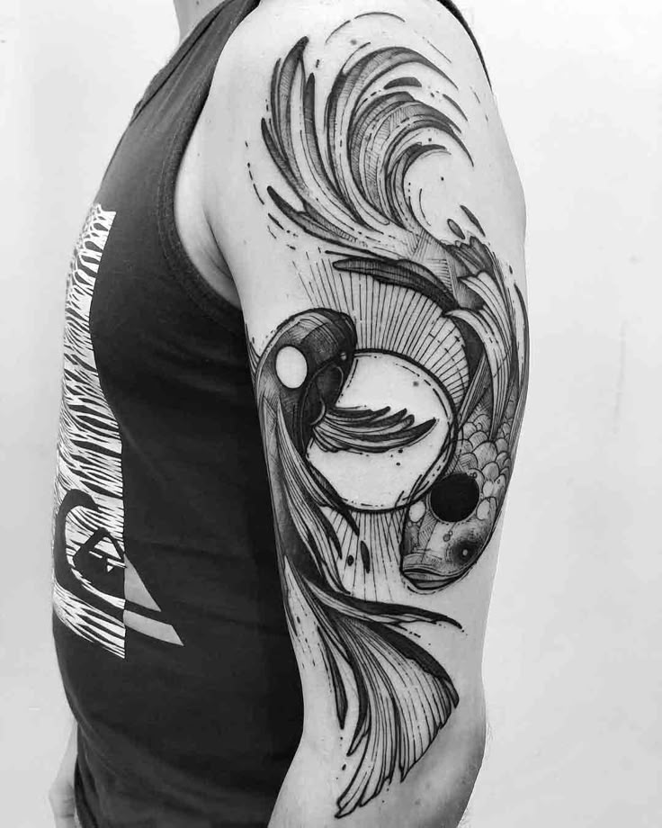 Красивая татуировка Инь-Ян на плече рыбы кои