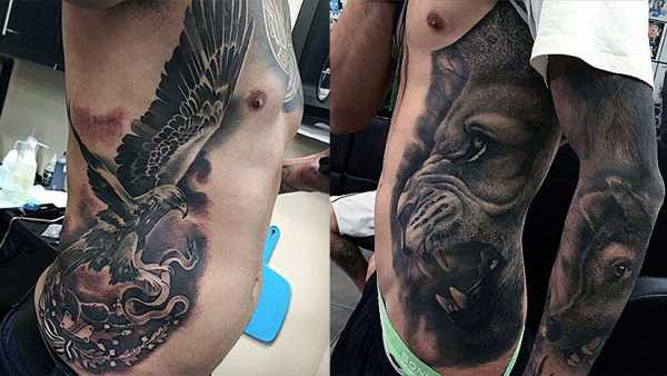 Тату на ребрах мужские сильно отличаются от женских, ведь они имеют четкие контуры и глубокий смысл. Лучшие мужские тату на ребрах – это те, которые отражают мужскую сущность. Именно поэтому среди представителей сильного пола популярны изображения агрессивных, хищных животных. К ним относятся тигр, орел и даже кит. Тату на ребрах лев означает, что ее обладатель уверенный в себе человек, который считает себя лидером и таковым является. Он не боится ответственности, он рискует и готов ко всему.