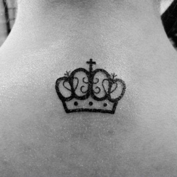 - Шея. Это наиболее популярное местоположение для нанесения татуировки в виде короны. Лучше наносить тату на заднюю часть шеи. Так ее можно закрыть длинными волосами при необходимости. Если девушка очень смелая, то можно нанести татуировки на горло или боковую часть шеи.