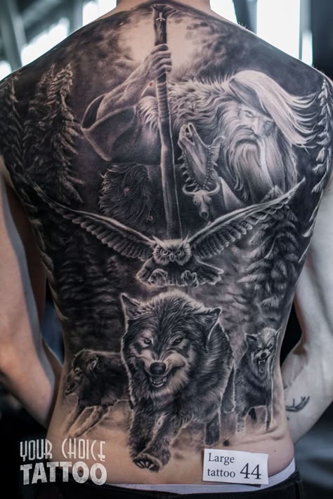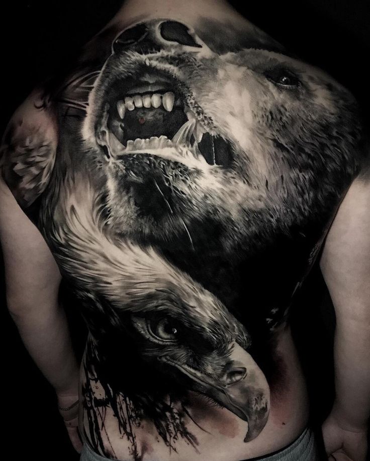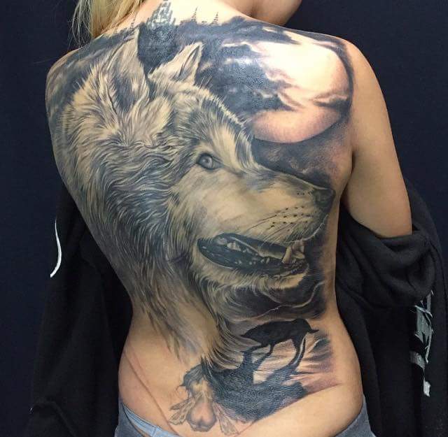Здесь очень важен размер татуировки, ведь чем больше татуировка, тем могущественнее она выглядит. Хорошим украшением татуировки станут перья, луна и цветы.