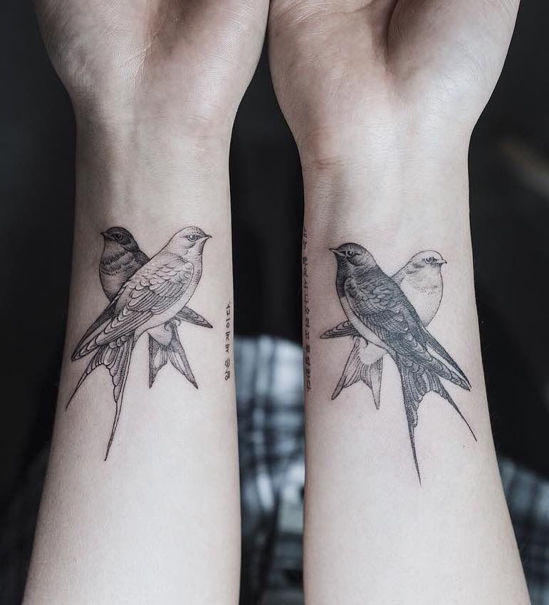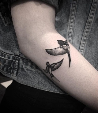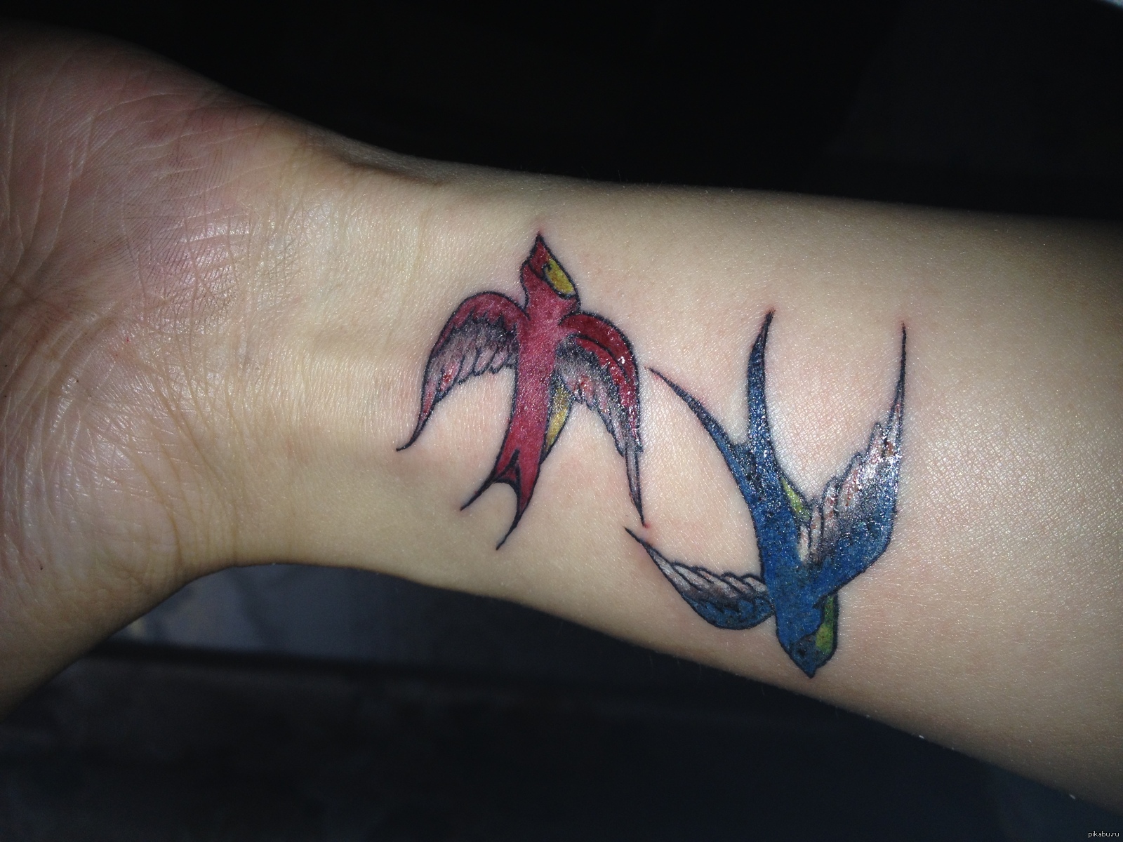- Пара ласточек – Пара ласточек на тату символизирует любовь и верность, поскольку ласточка считается верной птицей, у которой только один помощник на всю жизнь. Две ласточки на татуировке – родственные души и могут быть посвящены любовнику, супругу, другу или члену семьи.