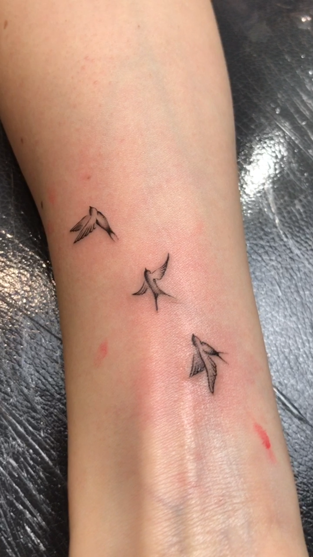 Обычно это небольшие аккуратные работы, которые хорошо смотрятся на любой части тела. Например, девушки часто изображают ласточек за ухом, на ключицах, кистях, щиколотках.
