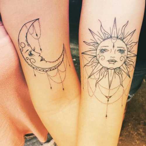 - Невероятные спросом пользуется этот символ в парных татуировках, когда мужчина набивает себе рисунок Солнца, а женщина — изображение Луны.