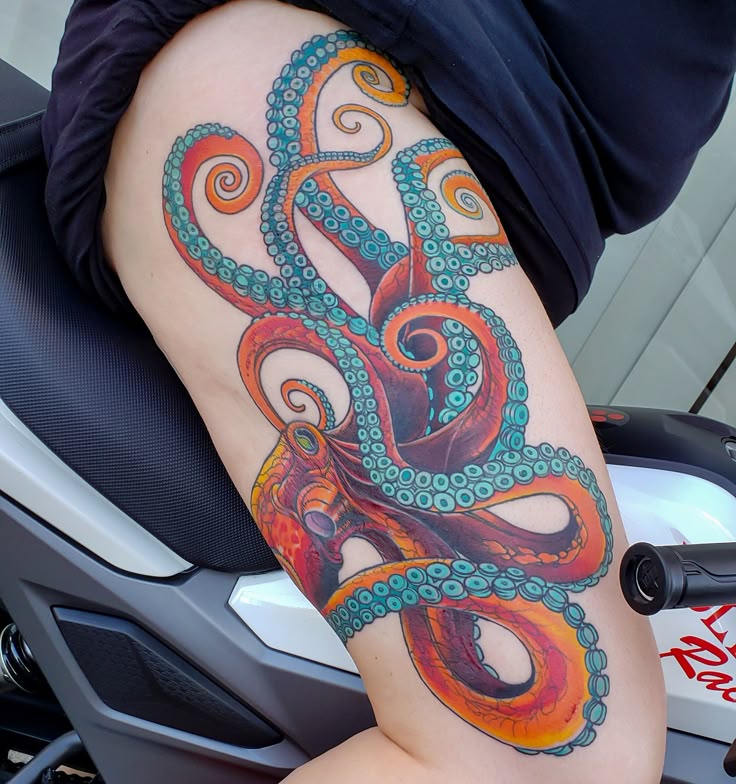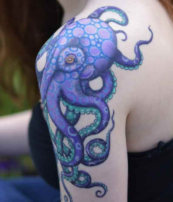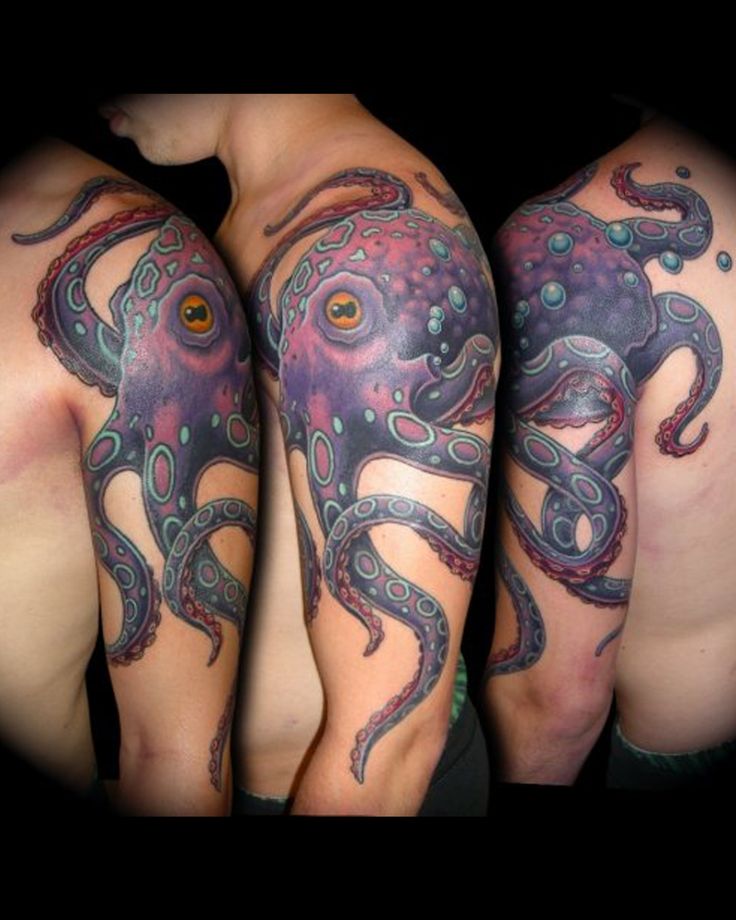 Цветные татуировки с осьминогами, в большинстве, представляют внешний вид моллюска, прорисованный в технике реализма.